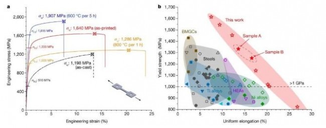 增材制造的AlCoCrFeNi2.1共晶高熵合金具有优异的机械性能,3D打印态合金的屈服应力可以达到1333MPa,拉伸极限为1640MPa,均匀延伸率为14%,并且在高流动应力时具有更高的加工硬化率。经800 °C,1h的热退火之后的样品,均匀伸长率超过20%,屈服强度达到了1GPa;持续600 °C,5h的退火后样品的屈服强度和极限抗拉强度增加到大约1.6 GPa和1.9 GPa,均匀延伸率则下降为7.5%。