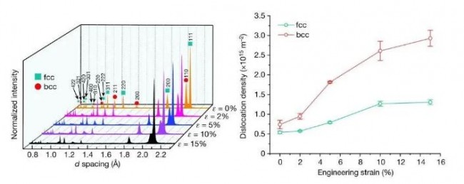 作者基于中子衍射技术,获取了共晶高熵合金中的fcc和bcc两相体积分数、晶格失配、晶格应变等重要的微观参数信息,同时采用modified Williamson-Hall (mWH)方法分析全谱衍射峰的宽化以得到两相分别的位错密度,说明了两相加工硬化能力的提升,为阐述超高强度-韧性背后的机理提供了支持。