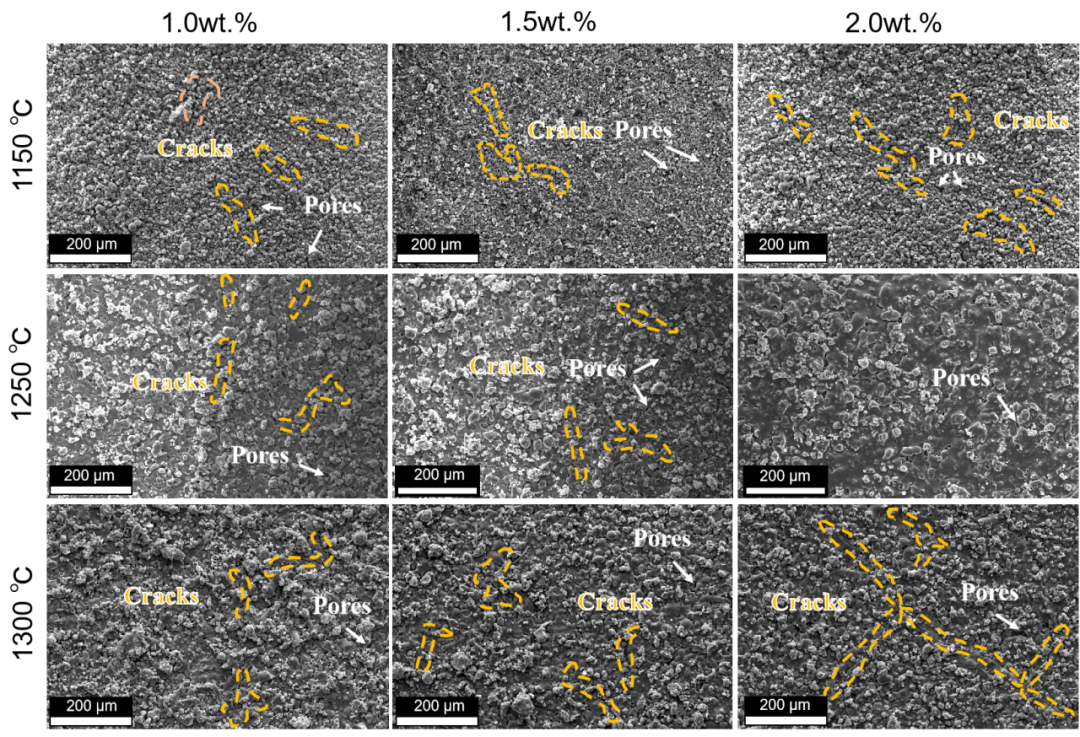 本研究探讨了不同纳米ZrO2含量(1.0wt.%、1.5wt.%、2.0wt.%)对光固化SiO2基陶瓷型芯在不同烧结终温(1150 ℃、1250 ℃、1300 ℃)下物理性能、力学性能及表面质量的影响,并通过相组成和微观结构演变分析了其影响机制。主要结论如下: