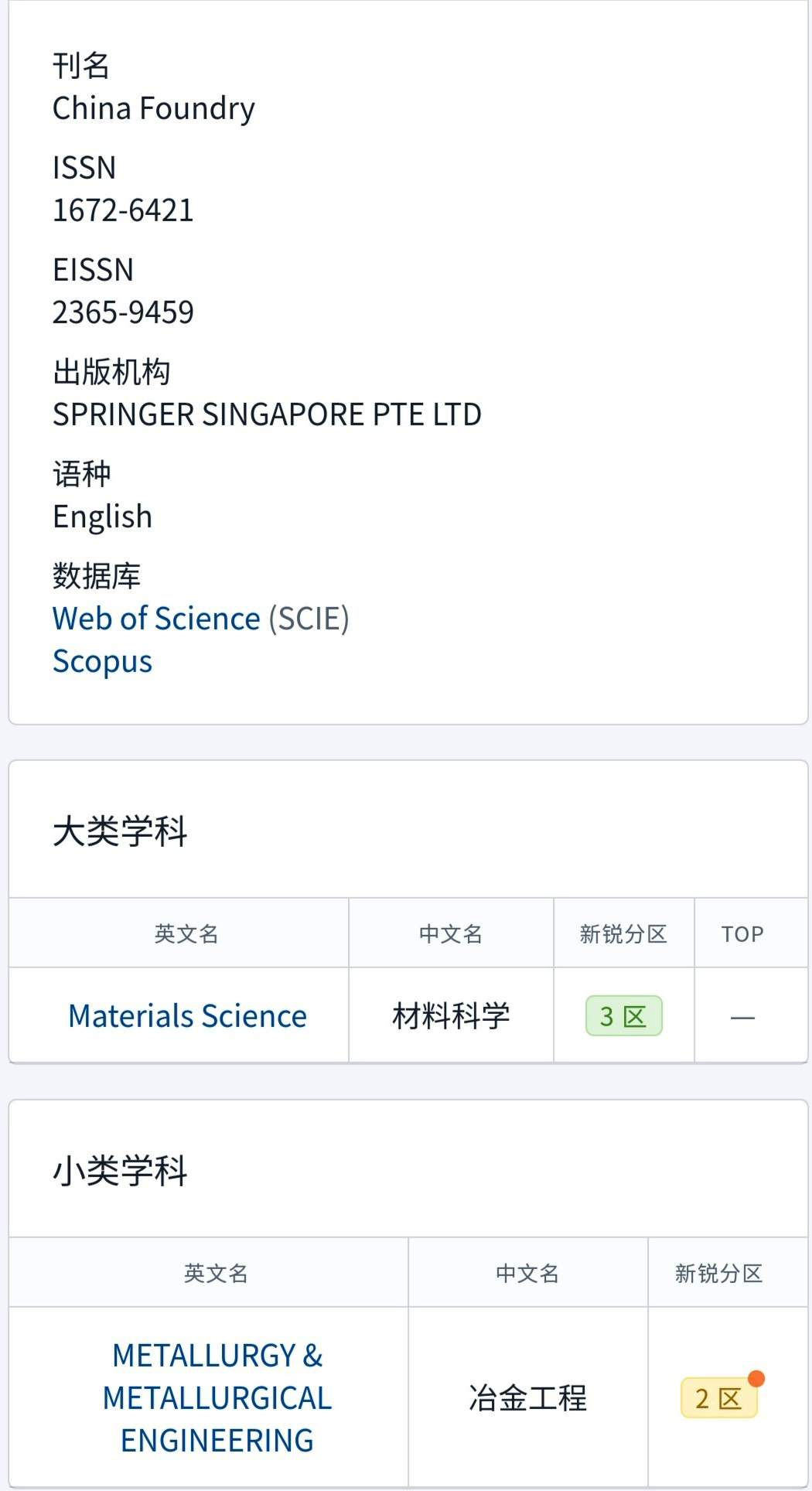 喜报|CHINA FOUNDRY期刊入选新锐分区冶金工程学科2区!